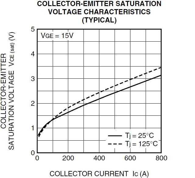 查到三菱CM400DY-34A和英飞凌FZ400R17KE3的晶体管特性与其完全相同,因此可以使用他们的“VCE-IC”特性曲线,获得制动晶体管的导通压降。